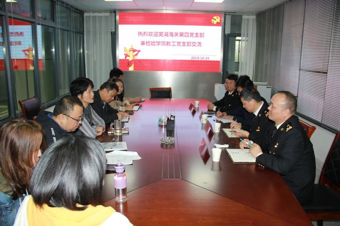 党支部交流相互学,经验分享共提升。为积极推进党建和业务深度融合,使“抓党建促发展、双提升双融合”落地生根,实现党建工作与业务工作双促进、共提升,10月25日,芜湖海关第四党支部书记胡家春,委员先裕飞、徐伟等一行来yl6809永利官网教工党支部开展支部共建交流学习活动。学院党总支书记、副院长崔晓霞,副院长浦春,教工党支部书记孙恩涛和教工支部全体党员参加了交流活动。