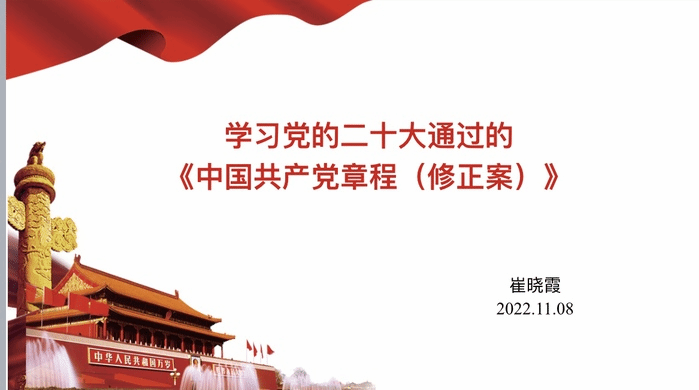 会议还开展了《中国共产党章程》读书班活动,崔晓霞从党章的地位和作用、修改原因与原则、具体修改内容,以及中国共产党人的初心使命等方面作《中国共产党章程》研读第一讲,详细解读了党章的重要内涵和精神实质,进一步加深党员对党章的了解。