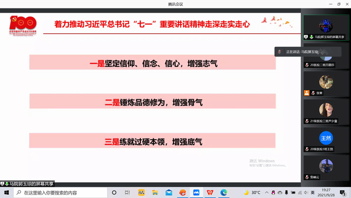 为深刻认识、准确把握习近平总书记“七一”重要讲话精神,深入解读中国共产党百年奋斗的光辉历程、伟大成就、宝贵经验、实践启示,以及伟大建党精神的深刻内涵和时代价值,9月28日晚,yl6809永利官网邀请马克思主义学院郭玉琼副教授,通过腾讯会议的方式作“七一”重要讲话精神专题宣讲。本次宣讲会由yl6809永利官网团委副书记张秦主持,2019级、2020级全体学生参加。