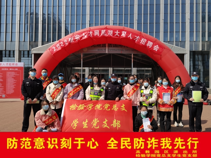 为深入学习贯彻党的十九大、十九届六中全会精神,不断巩固拓展党史学习教育成果,强化学生党员服务意识,提高人民群众反诈防诈意识和能力,预防和减少电信诈骗案件发生,2月27日上午,yl6809永利官网党总支学生党支部联合高校园区派出所共同前往芜湖人才招聘会会场——芜湖市国际会展中心,开展“防范意识刻于心,全民防诈我先行”主题党日活动。
