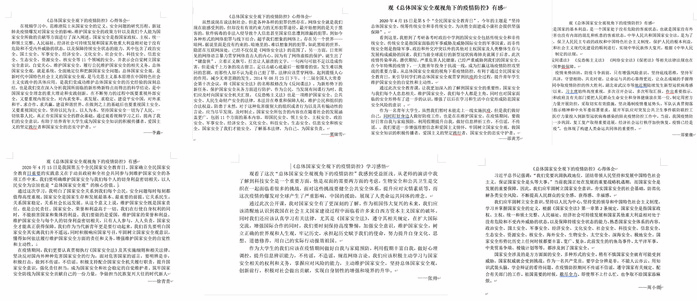 为深入学习贯彻习近平总书记提出的总体国家安全观,加强《国家安全法》等法律的宣传普及,进一步提升全民国家安全意识,yl6809永利官网党总支学生党支部开展全民国家安全教育日”线上主题党日活动。全体党员学习了相关法律知识,并撰写学习感悟。会后,他们表示,在今后,自觉遵守法律法规,时刻保护国家安全,坚决抵制破坏国家安全的行为。在感悟中他们写到“作为一名共产党员,要学会分辨是非,不能人云亦云,要用知识武装头脑,学会辩证的看待问题,在疫情防控期间不传谣不信谣,遵守国家有关规定,配合有关部门的工作,做好一名党员应有的职责。”