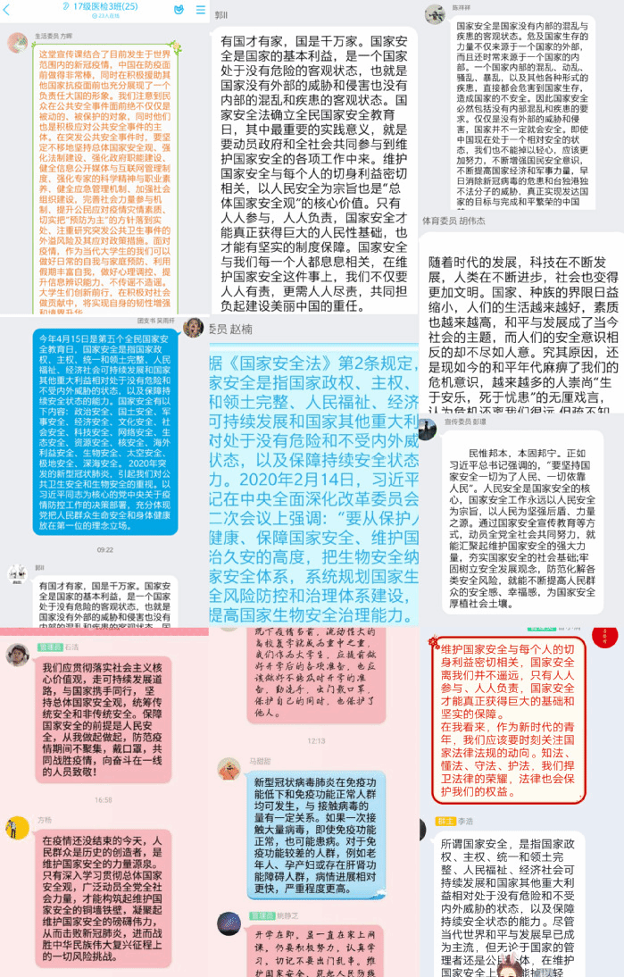 2020年4月15日是第五个全民国家安全日,yl6809永利官网2017级紧扣“坚持总体国家安全观,统筹传统安全和非传统安全,为决胜全面建成小康社会提供坚强保障”为主题,通过“云”班会、向全体学生和学生党员开展了一系列国家安全教育宣传活动。