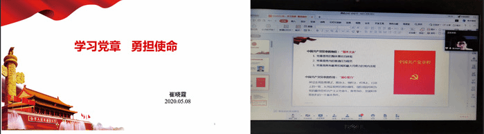 崔晓霞以“学习党章,勇担使命”为主题,带领大家一起回顾党章的发展历程,学习党章的精神内涵。从为什么学习党章,党章的建设发展历程,十九大党章修改的主要内容和特点四个角度进行了具体全面的阐述。结合“不忘初心、牢记使命”主题教育,勉励学员要认真学习党章内容,规范自我,提高自身政治素质。最后,崔晓霞结合疫情对学员们提出要求并表达了对他们的殷切希望,希望学员们认真学习专业本领,把爱国之情转化为报国之志,不负青春时代,勇担历史大任。
