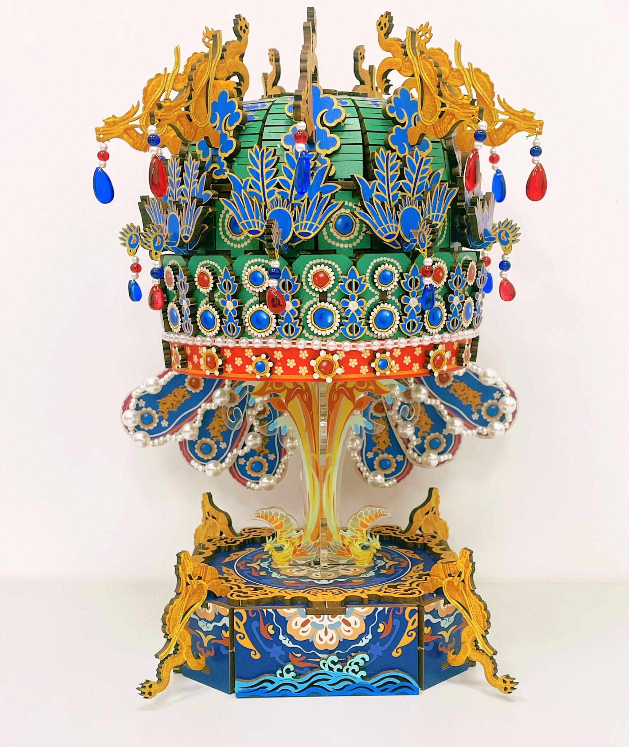 活动上,师生一起中英双语学习了解了凤冠制作的起源与发展。这顶孝端皇后九龙九凤冠,重达2320克,上有以累丝工艺制作的金龙九条,均口衔“珠滴”,珠滴由一红一蓝两个宝石间两颗珍珠串成;其下为九只点翠工艺制作的凤鸟,同样口衔红蓝宝石珠滴;口圈一周有“金宝钿花”12个,冠上有48个,全冠共计金宝钿花60个,“金宝钿花”是由黄金、宝石、珍珠组合而成的花型装饰;其间“铺翠”,有翠云、翠叶、株翠花等装饰满铺在冠上。冠两侧后方为“博鬓”,是专门表示尊贵身份的假鬓,行走时会随着身体的摆动而展开。
