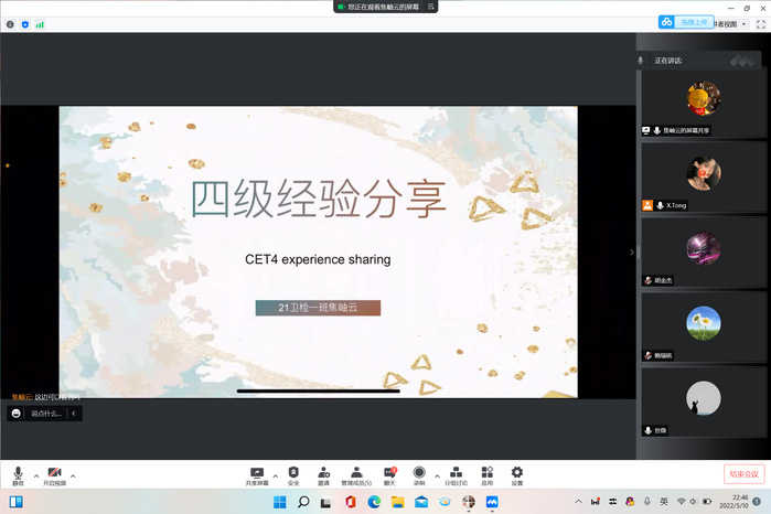 为加强年级学风建设,明确英语四级考试重点,掌握考试复习技巧,同时为响应《促进全民阅读 建设“书香皖医”工作实施方案》相关要求,营造浓厚读书氛围,6月3日中午,yl6809永利官网2021级通过腾讯会议召开英语四级高分经验分享和读书交流会,年级全体同学参加。