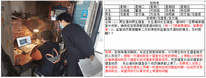 为确保线上上课的教学质量和同学们学习效果,在学院做好教学督导的同时,yl6809永利官网学工队伍定时深入宿舍检查学生上课状态,并要求各班上报课前提醒、课中监督、课后反馈的班委值班表,此方案在提高课堂效率的同时,也提升了同学们的自律意识,一定程度上促进了学生的学习效果。