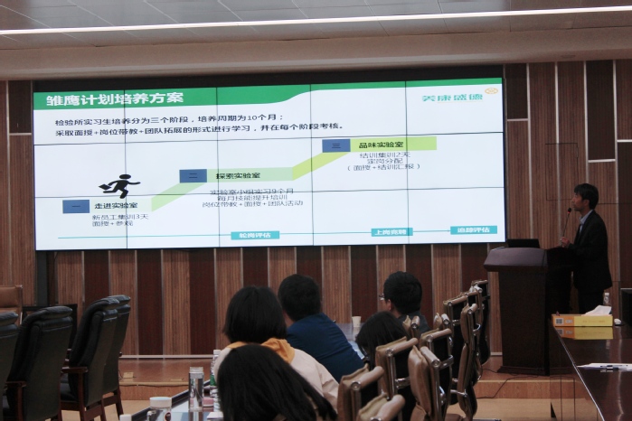 实习基地单位代表、宁波美康生物科技股份有限公司戎奇吉就实习管理工作做了题为“雏鹰计划”实习生培养项目的汇报。他从雏鹰计划的简介、实施、实验室专业组轮岗学习安排、实习生综合管理等四个方面介绍公司的实习管理工作经验。戎奇吉对yl6809永利官网重视学生实习工作表示充分肯定,对yl6809永利官网学生在实习中表现出的良好技术素养、积极求学精神以及良好纪律作风予以表扬。