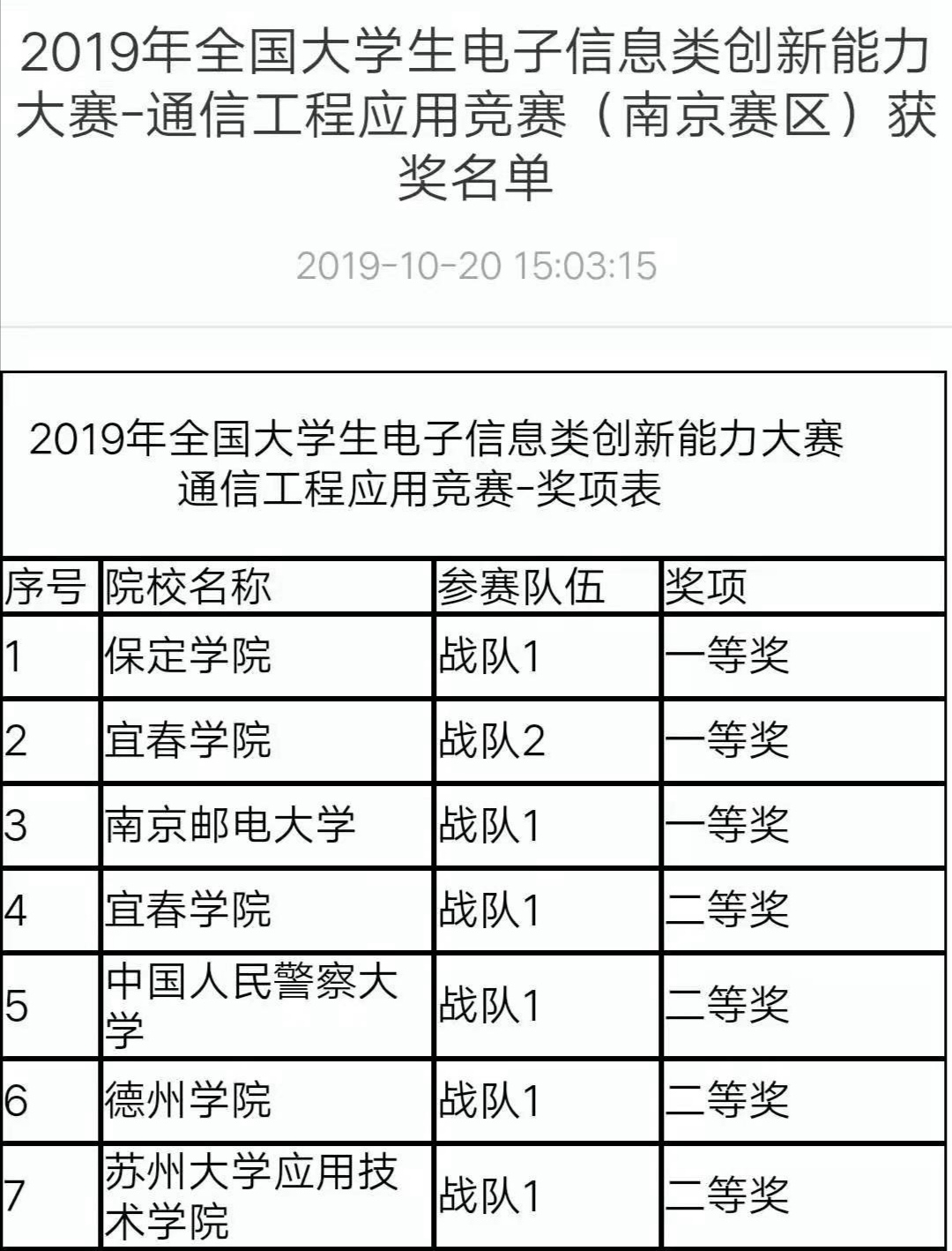 10月19日至20日,2019年全国大学生电子信息类创新能力大赛通信工程应用竞赛(南京赛区)在南京邮电大学举行,Beat365官网学生李剑峰、王凯宇组成的代表队(指导教师:王兆玮、金成),以良好的专业素养和出色的现场表现夺得第一名,顺利进入全国总决赛。