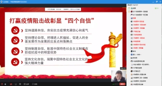 在这场突如其来的大考中,中国经受住了考验,中国人民更加坚定了打赢这场疫情阻击战的信心。这种信心和底气来自我们对中国特色社会主义的道路自信、理论自信、制度自信、文化自信。赵老师希望党员和入党积极分子要牢固树立“四个意识”,坚定“四个自信”, 坚决做到“两个维护”,厚积薄发,蓄力起航,做新时代合格的新青年。