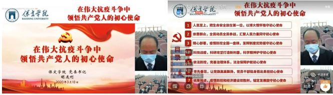 为认真落实《党委(党组)落实全面从严治党主体责任规定》和《2019-2023年全国党员教育培训工作规划》,把学习贯彻习近平新时代中国特色社会主义思想作为首要政治任务一以贯之,把党的思想建设作为基础性建设来抓,坚定理想信念,坚持思想建党、理论强党、从严治党,3月18日下午,校党委书记胡连利以《在伟大抗疫斗争中领悟共产党人的初心使命》为题,通过互联网上了一堂别开生面的线上党课。