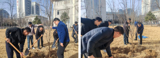 活动现场,春风和煦,党徽闪耀。党员们热情高涨,干劲十足。大家三两成组,默契配合,挥锹铲土、扶正树苗、培实新土,每一个环节都一丝不苟,每一个步骤都井然有序。经过一番辛勤劳动,一株株新栽种的树苗迎风挺立,在明媚的春光中展现出勃勃生机,为初春的校园增添了一片新绿,也种下了新的希望。