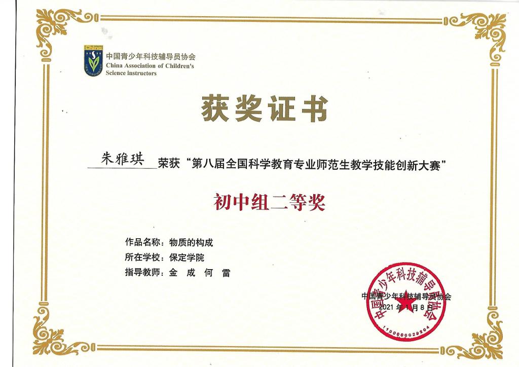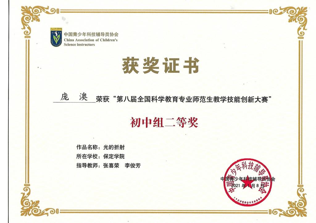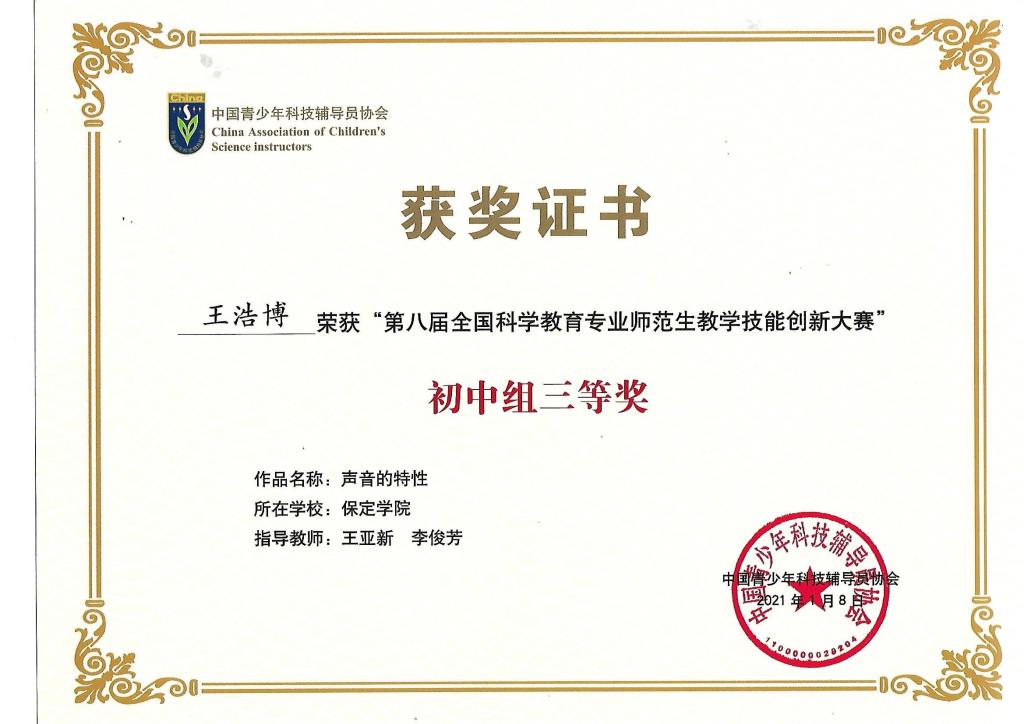 2020年12月13日,由中国青少年科技辅导员协会主办、浙江师范大学和中国青少年科技辅导员协会、科学教师教育专业委员会共同承办的第八届全国科学教育专业师范生教学技能创新大赛决赛圆满结束。为顺应“互联网+”和创新教育趋势,本次大赛在对原有赛制进行改革创新的基础上,增设了网络初赛,内容包括教学设计、教学微课和科技教育活动方案设计等。23日,组委会公示成绩,Beat365官网2017物理学专业庞澳荣获二等奖(指导教师张喜荣、李俊芳)、朱雅琪荣获二等奖(指导教师金成、何雷)、王浩博荣获三等奖(指导教师王亚新、李俊芳)。