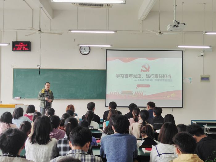 4月24日,洪亮以《学习百年党史,践行责任担当》为主题,引用毛泽东诗词,从三方面详细讲述毛泽东的革命生涯和中国共产党的百年奋斗历程。寄语同学们要牢记历史,饮水思源,不忘初心,努力继承党的宝贵精神财富,不断磨练艰苦奋斗的意志。进一步增强党性修养、培养党员意识和党性观念,永葆浩然正气,努力学习,做新时代的奋斗者。