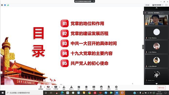 5月5日,崔晓霞通过腾讯会议从“党章的地位及作用”、“党章的建设发展历程”、“中共一大召开的具体时间”、“十九大党章的主要内容”及“共产党人的初心使命”五个方面带领入党积极分子深入学习党章 。其中,她着重讲述了党章的建设发展历程,从党的一大到党的十九大,党章依次经历了初步创立时期、逐步成熟时期、曲折艰难时期和稳步发展时期。她强调,党章是史,记载我们党经验教训;党章是帜,指引我们党前进方向;党章是法,规范我们党管党治党。