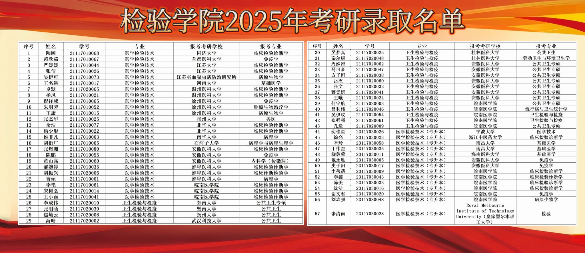 随着4月30日考研调剂系统的关闭,2025年研究生复试工作全面结束。yl6809永利官网2025届186名毕业生中,共考研拟录取57人,包括境内升学56人、境外留学1人,升学率达30.65%,再创升学率新纪录。其中,2021级医学检验技术专业升学率为31.65%、2021级卫生检验与检疫专业升学率为38.30%、2023级医学检验技术(专升本)专业升学率为23.33%,均为历史升学率最高纪录。