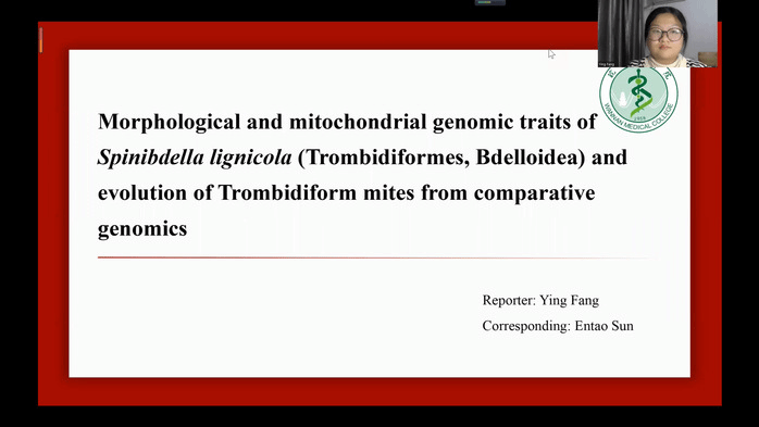 方颖同学以Morphological and mitochondrial genomic traits of Spinibdella lignicola (Trombidiformes, Bdelloidea) and evolution of Trombidiform mites from comparative genomics为题进行汇报,该研究以居木针吸螨的线粒体基因组测序和分析为基础,结合现有的绒螨目线粒体基因组做了比较基因组分析,揭示居木针吸螨的线粒体基因组特征并从比较基因组学角度提供了绒螨目的进化见解会议期间,孙恩涛教授和方颖同学与与会专家学者进行了充分的交流学习。