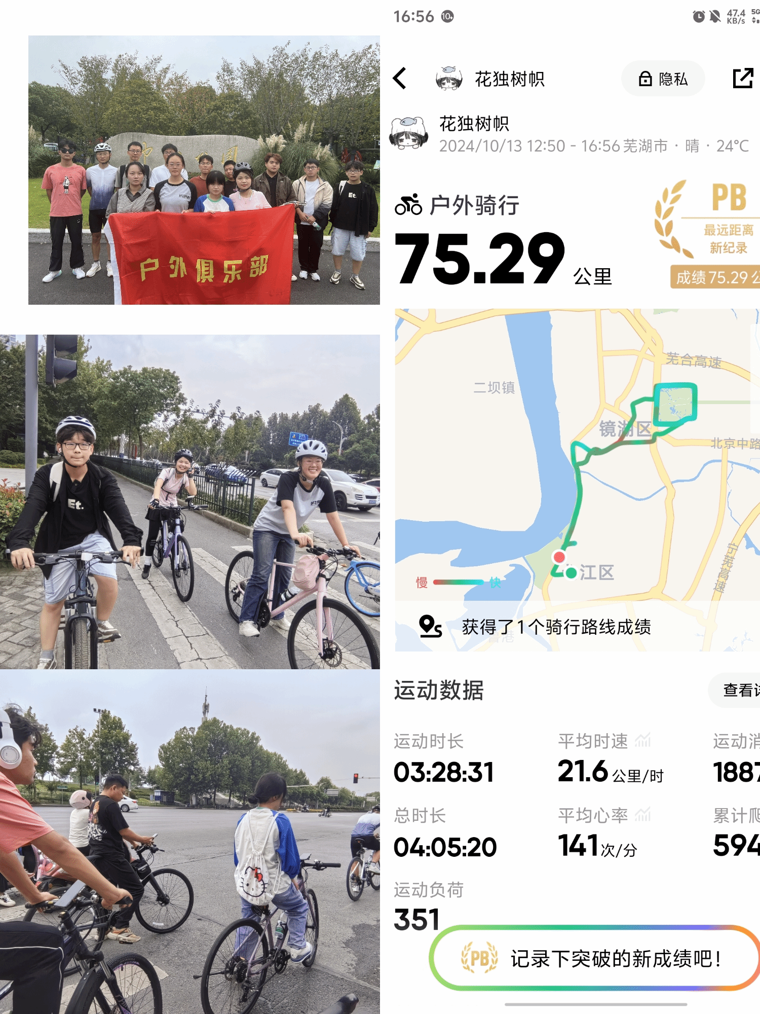 活动伊始,户外俱乐部指导老师刘影对本次骑行活动的规则、路线安排和安全注意事项等进行再次强调,并宣布骑行开始,骑手们精神抖擞地踏上了这场特殊的骑行之旅。同时有17名后勤人员定点定时为他们提供保障和物资。从yl6809永利官网滨江校区(北区)南门出发至神山公园,在神山公园外接力绕行七圈后,返回学校,全程75公里。骑行过程中,骑行爱好者们不仅领略了芜湖的城市风光,还感受到了运动的快乐。他们利用骑行软件记录自己的运动轨迹,同时顺利骑行了75公里,是骑行爱好者们对祖国深情厚谊的体现。在骑行过程中,骑行队伍中的骑手们相互鼓励,接力骑行,共同完成了这项挑战。同学们纷纷表示,能够以这样一种独特的方式为祖国庆生,感到非常荣幸和自豪。