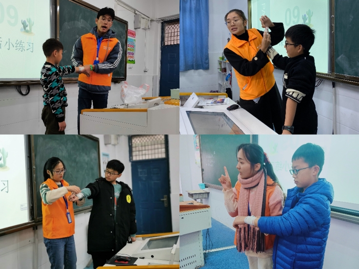 接下来由志愿者庄佳豪等五人耐心地教小学生们环形包扎、螺旋包扎和“8”字包扎三种方法,指导小朋友进行实际操作。活动过程中,小学生们积极动手,主动配合,对这三种包扎方法有了一定的掌握。
