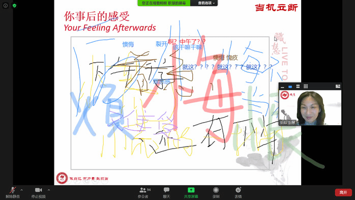 陈欣老师以同学们为自己的拖延症“体检”为切入点,通过一份问卷导入对拖延症的认知,解释时间管理与拖延症的区别。从“当”、“机”、“立”、“断”四个方面对拖延症进行剖析,借助“敢作敢当”、“立即行动”、“增强动机”、“消除干扰”四个角度对拖延症的表现、特点、弊端展开分析,同时通过“克服恐惧”、“成长型思维”等观点来解答克服拖延的方法。最后鼓励同学们从现在起改变固有状态,跟着课程讲授的方法去逐步改善自己的拖延症。
