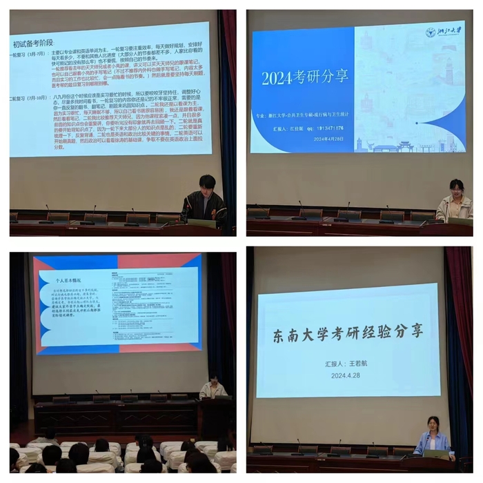 为促进低年级学生对考研知识和经验的了解,帮助学生尽早确立奋斗目标,营造积极向上的学风。4月28日晚上,学院邀请了2024届医学检验技术专业的陈仁杰、刘雪婷和卫生检验与检疫专业的王若航、江佳妮四位考研上岸的毕业生在逸夫科技楼一楼报告厅举办了2024年考研经验交流会,学院2025届全体考研学生和部分其他年级学生参加,会议由yl6809永利官网团委书记、辅导员曹玉祥主持。