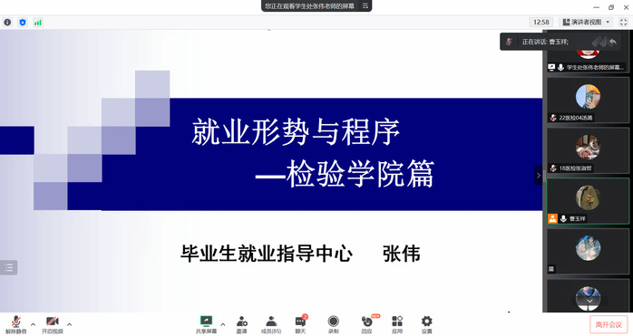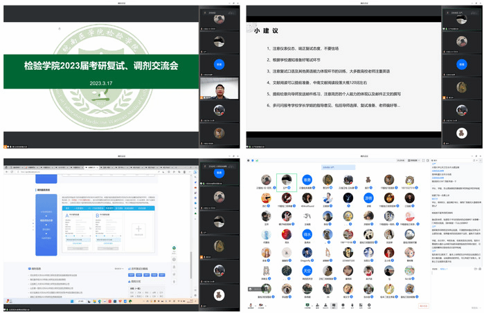 会上,2022届毕业生中南大学研究生王严、徐州医科大学研究生朱寒勇、中国疾病预防控制中心研究生施宇涛和桂林医学院研究生王长勇四位同学分别从复试准备、调剂系统功能掌握、调剂信息获取、导师选择、B区学校情况等方面进行了讲解和交流,并祝同学们考研成功上岸,一“研”为定。