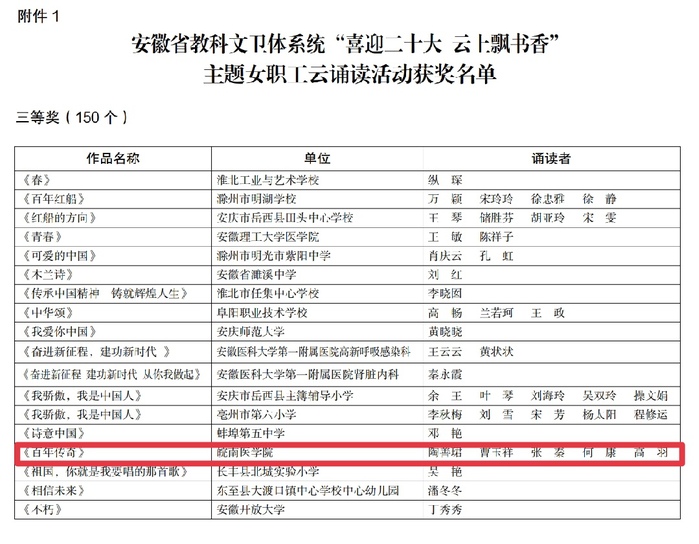 陶善珺、曹玉祥、张秦、何康、高羽等5位同志诵读的作品《百年传奇》在激烈竞争中脱颖而出,荣获三等奖。“你从历史的雄壮中走来,苦难与辉煌见证了你的风采。一百年前,嘉兴红船上的灯火,唤醒了华夏屈辱的梦魔,镰刀铁锤在血与火的洗礼中……”,5位朗诵者以自信大方的神态、真挚饱满的热情、抑扬顿挫的嗓音,把党的百年征程如画卷般在我们面前展开,从小小红船到巍巍巨轮,从春天的故事到新时代华章……百年大党继往开来再出发,将中国梦的华彩篇章书写在神州大地上。5位朗诵者既代表yl6809永利官网的师生员工表达了对党和祖国的忠诚信仰和美好祝福,也在全省文教卫系统大舞台上展现了新时代检验人的风采。