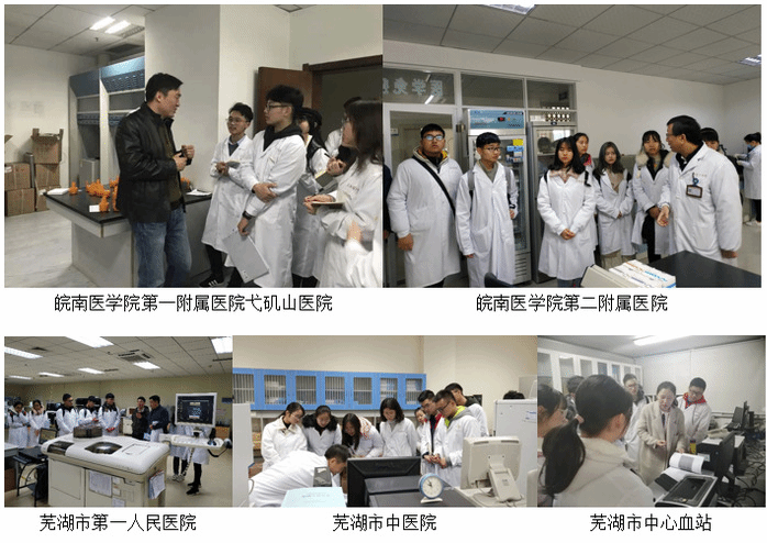 在yl6809永利官网第一附属医院弋矶山医院、第二附属医院、芜湖市第一人民医院、芜湖市中医院、芜湖市中心血站,在检验科负责老师的介绍下,54名医学检验技术专业学生了解了检验科的工作环境、工作流程以及检验仪器的使用方法、操作规程及注意事项。芜湖市第一人民医院检验科崔凡主任,以“如何成为一个合格的检验人”为题,传授了在校期间如何合理安排专业学习和课外活动,为将来进入工作岗位更好的适应工作和发展需要打下基础,使同学们受益匪浅。