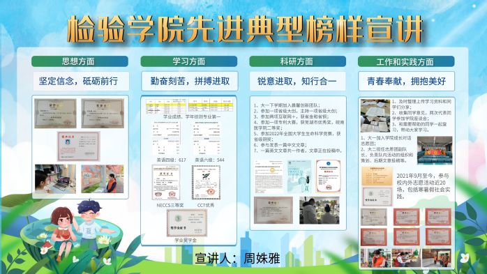 为帮助2023级新生更好地适应大学生活,充分发挥先进典型的示范带头作用,激励引导新生崇尚先进、学习先进,yl6809永利官网于9月20日晚在逸夫科技楼3104教室开展了先进典型宣讲活动。宣讲由近两年学业成绩和综合测评成绩均为专业第一的2021级卫生检验与检疫专业周姝雅同学主讲,全体2023级新生参加。