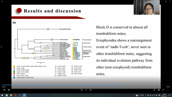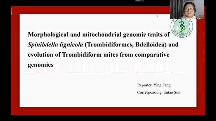 方颖同学以《Morphological and mitochondrial genomic traits of Spinibdella lignicola (Trombidiformes, Bdelloidea) and evolution of Trombidiform mites from comparative genomics》为题进行汇报,该研究以居木针吸螨的线粒体基因组测序和分析为基础,结合现有的绒螨目线粒体基因组做了比较基因组分析,揭示居木针吸螨的线粒体基因组特征并从比较基因组学角度提供了绒螨目的进化见解。会议期间,孙恩涛教授和方颖同学与与会专家学者进行了充分的交流学习。