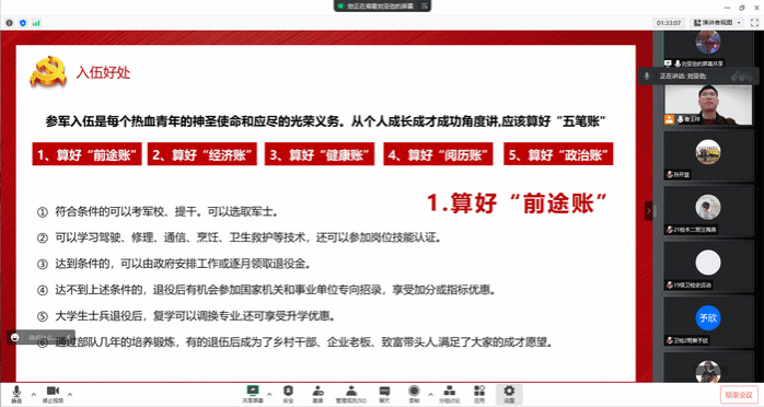 筑梦军旅,强军报国;投笔从戎,青春无悔。为响应党和国家号召,积极宣传征兵入伍政策,鼓励大学毕业生参军入伍报效祖国,yl6809永利官网于3月5日下午线上举办毕业生征兵入伍政策宣讲会。本次宣讲会邀请学生处国防教育科科长孙开慧和2022级医学检验技术专升本专业退役学生刘亚劲进行宣讲,yl6809永利官网2023届全体毕业生和辅导员参会。会议由毕业班辅导员曹玉祥主持。